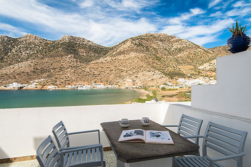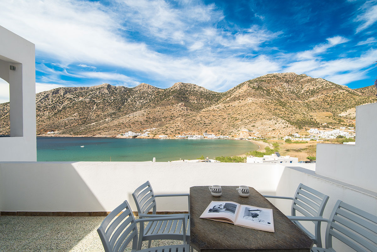 Sie bestehen aus 2 separaten Zimmern und haben einen eigenen Balkon oder eine Terrasse mit Blick auf das Meer und den Strand von Kamares.